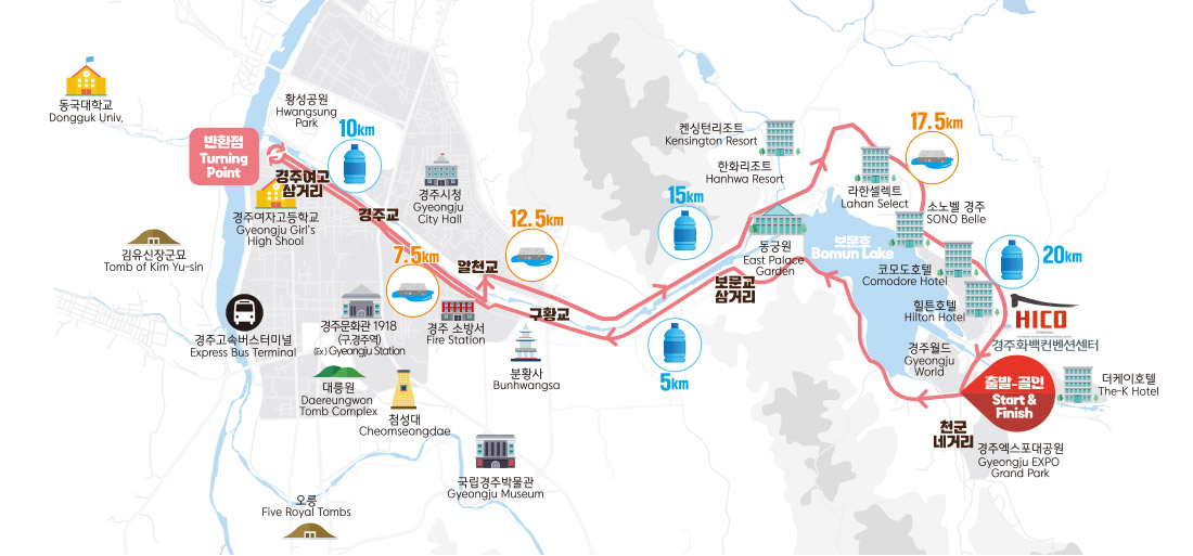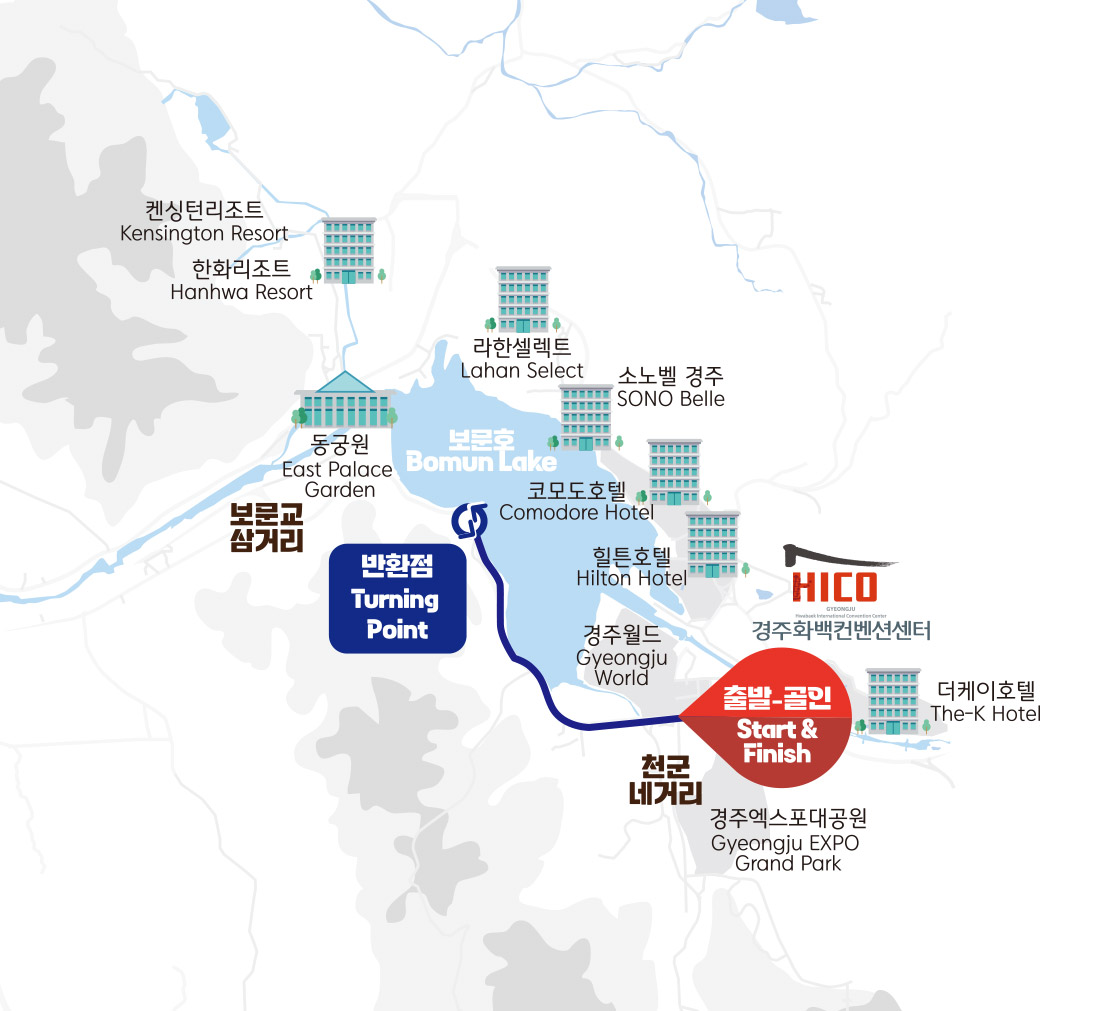 | 10K | 보덕동행정복지센터 → 경주월드 우회전 → 반환 → 커피명가 → 보문삼거리 → 힐튼호텔사거리 → 골인 |