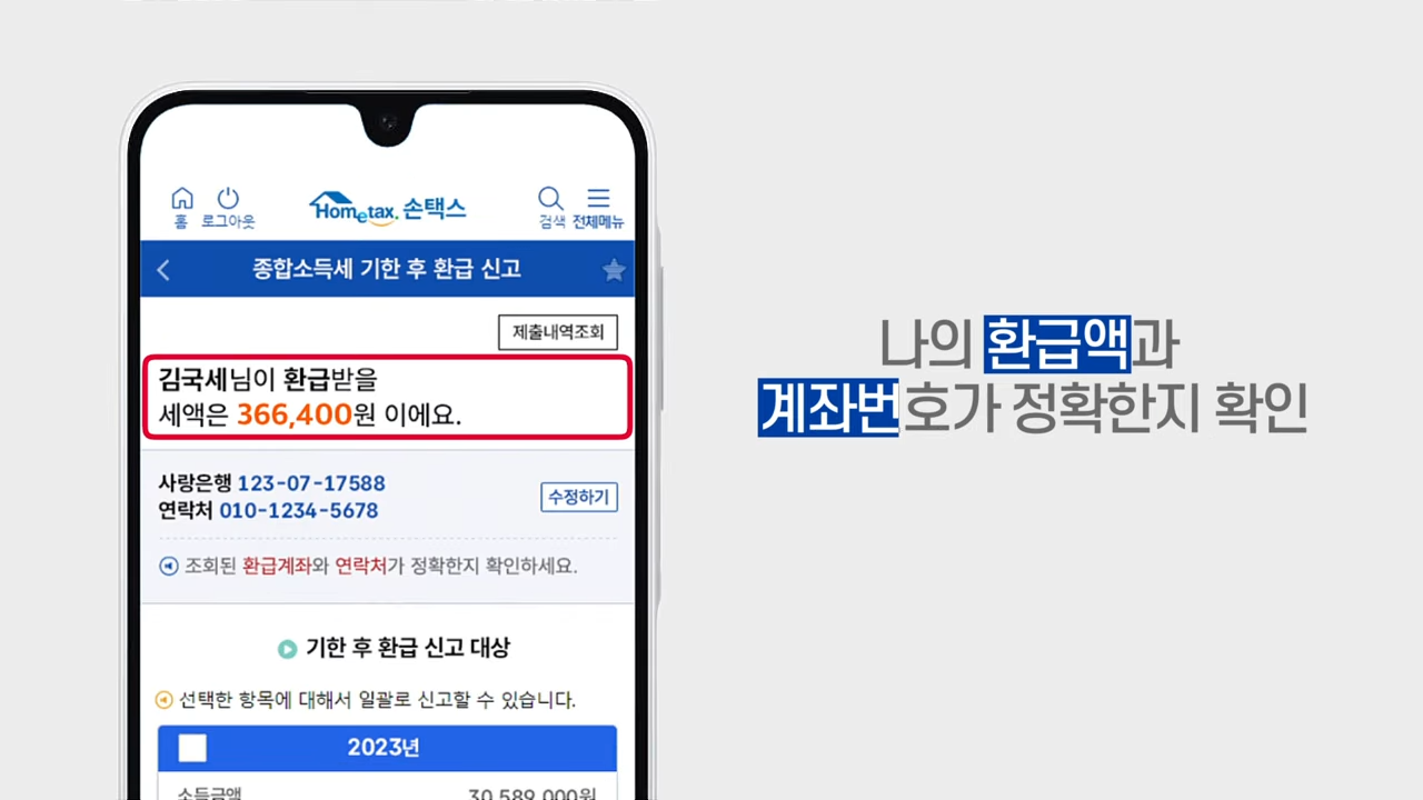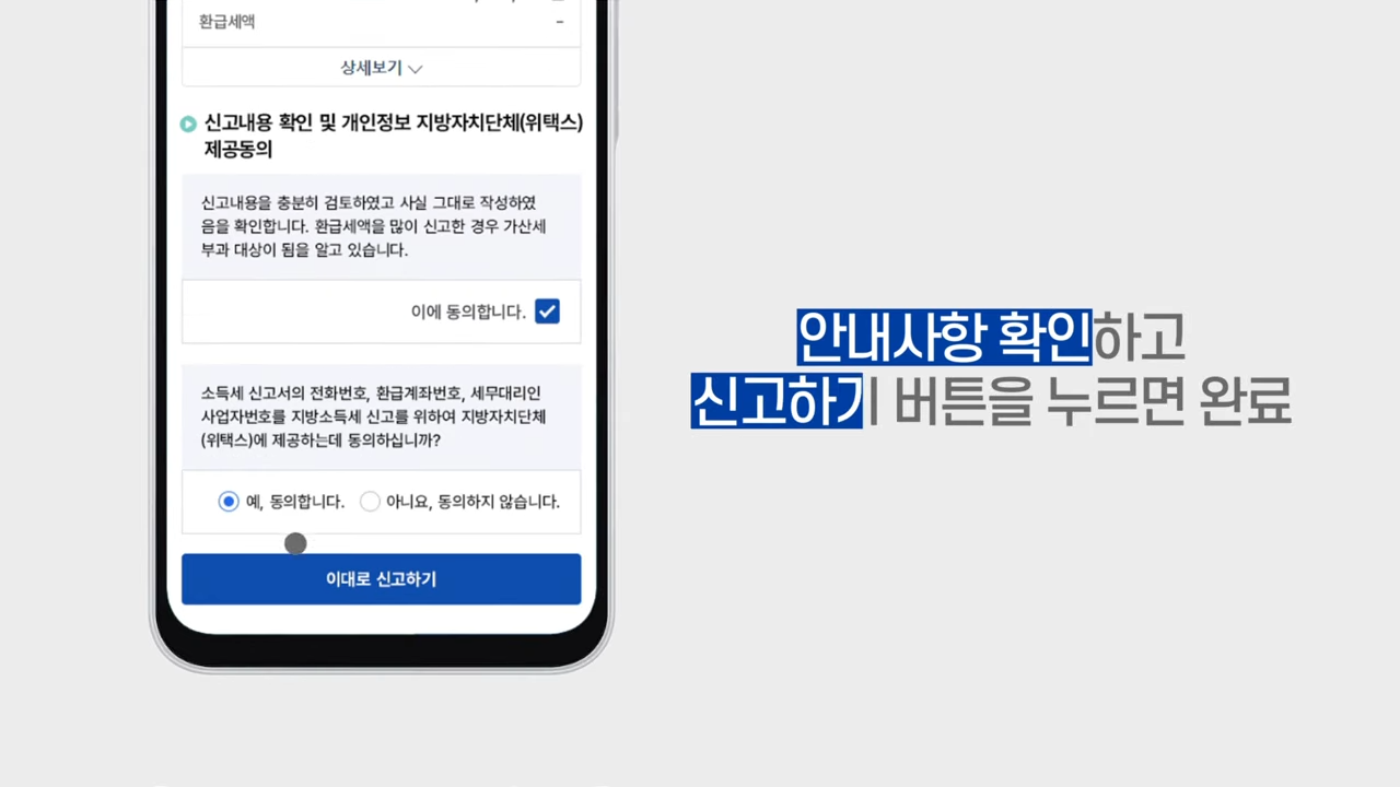 - 국세청이 자동 계산해준 환급액을 확인합니다.
