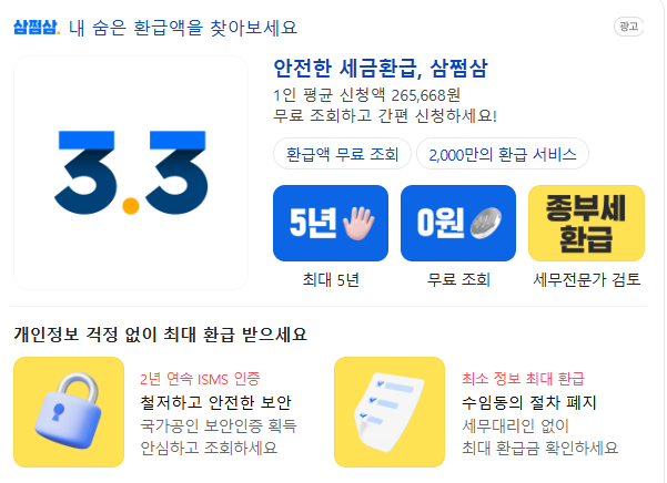 매년 종합소득세 환급 신청 시 ‘삼쩜삼’ 같은 민간 서비스를 이용하면 10~20% 수수료가 발생합니다.
