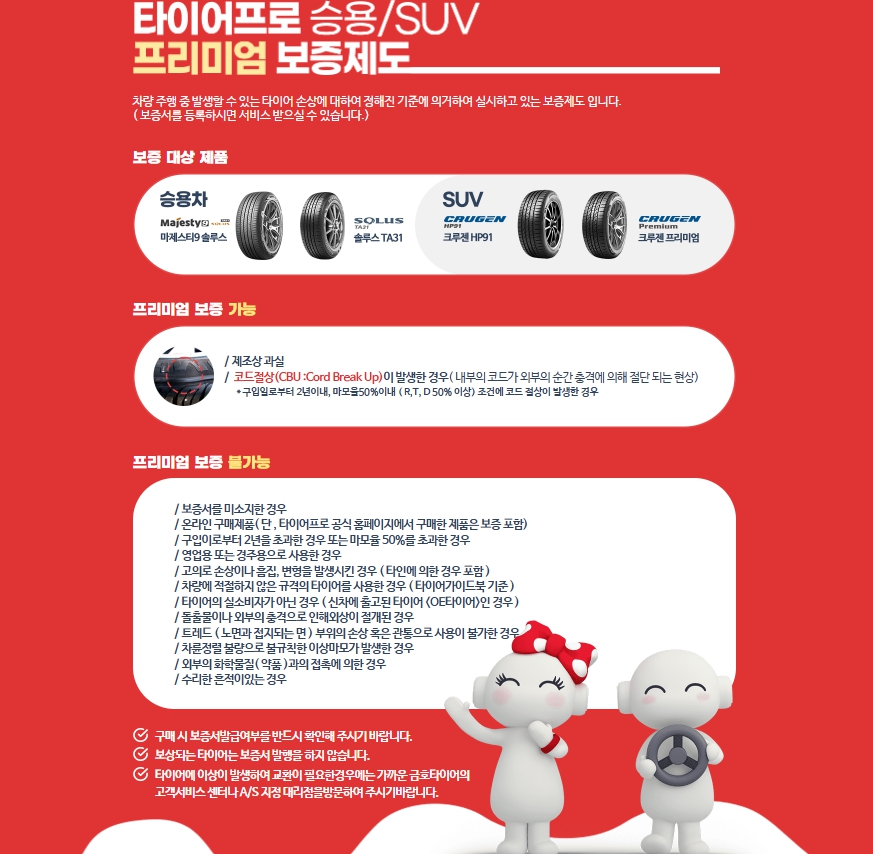 | 무상 교체 서비스 | 계약 기간 내 타이어 파손 시 1+1 교체 보장 |