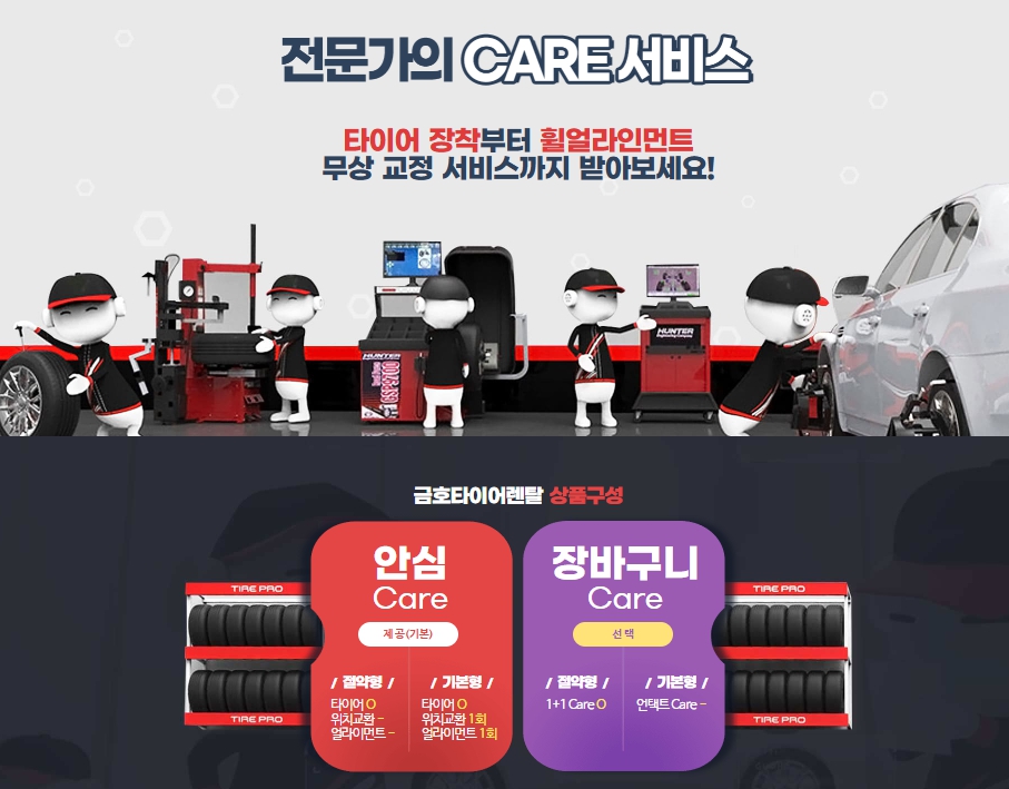 금호타이어 렌탈 고객이라면 전문가 CARE 서비스를 받을 수 있습니다. 타이어 장착부터 휠 얼라인먼트까지 무상 교정 서비스를 제공합니다! 🏆