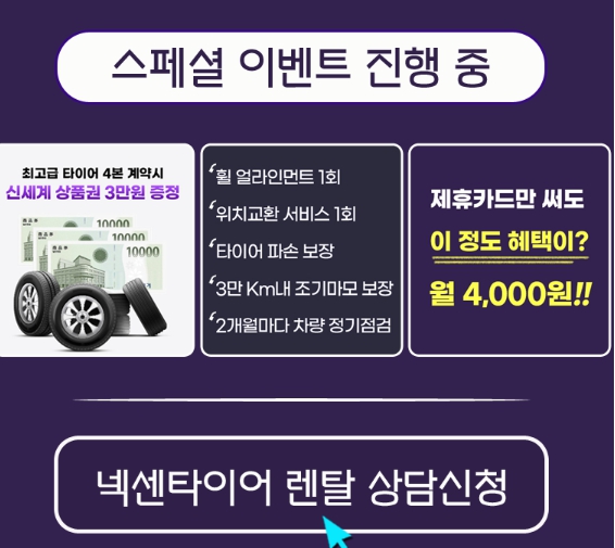 타이어 교체 비용 부담되시나요? 넥센타이어 렌탈 서비스로 고품질 타이어를 부담 없이 이용하세요! 자동차를 운행하는 분들이라면 누구나 한 번쯤 타이어 교체 비용 때문에 고민해보셨을 겁