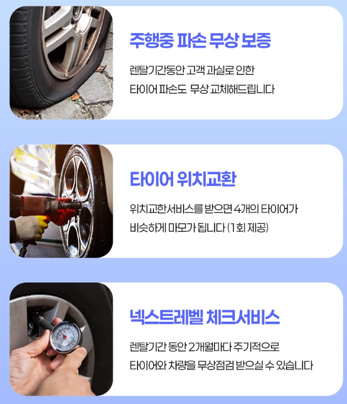 그런데 렌탈 서비스는? 월 2만 원! 한 번에 큰돈 안 들이고, 필요할 때 새 타이어로 갈아끼울 수 있는 거죠. 게다가 타이어 교체만 해주는 게 아니에요. 장착비, 얼라이먼트, 위치교환, 마모 보증까지 관리 패키지가 통째로 포함!