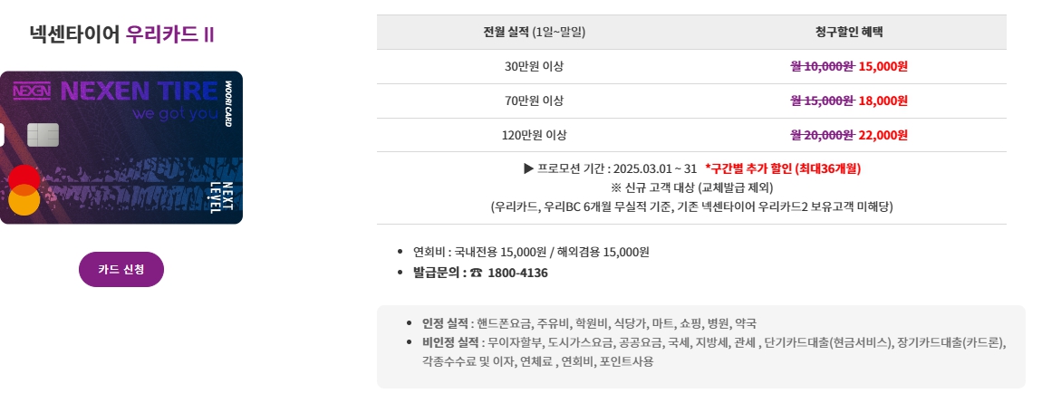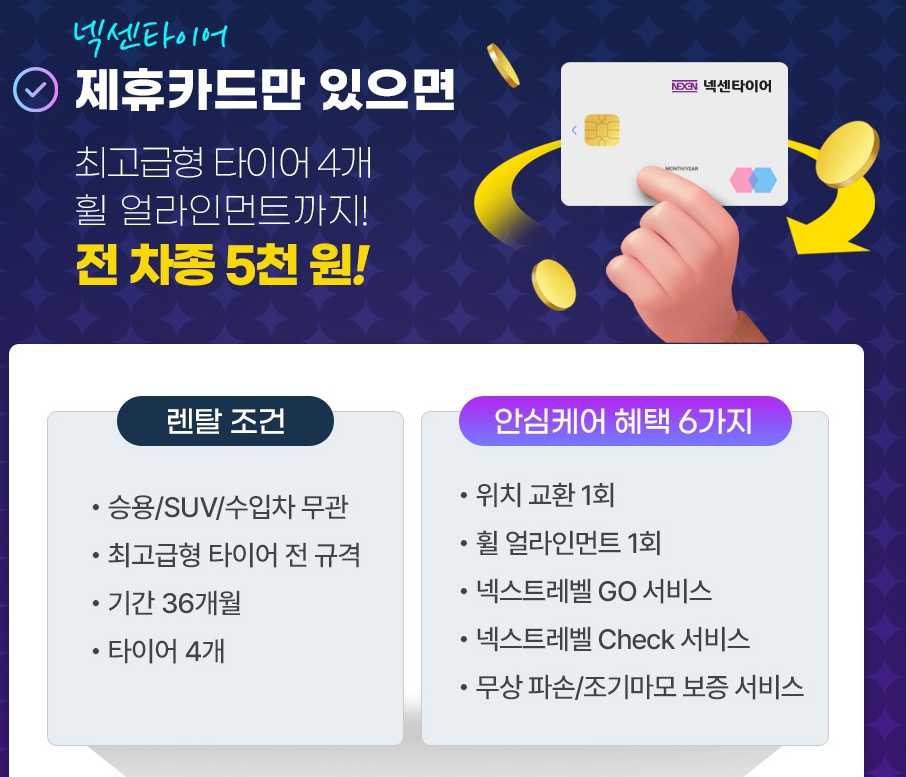 넥센타이어는 다양한 카드사와 제휴하여 렌탈 비용을 더욱 절감할 수 있도록 돕고 있습니다. 특정 카드로 결제하면 추가 할인과 캐시백 혜택을 받을 수 있습니다.