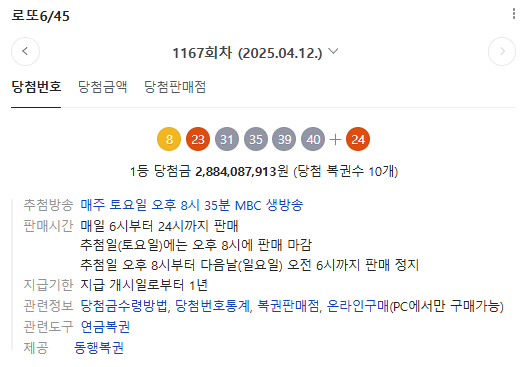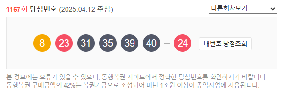 - 제1167회 로또 추첨일: 2025년 4월 12일