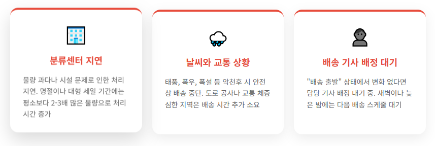 태풍, 폭우, 폭설 등 악천후 상황에서는 안전상의 이유로 배송이 일시 중단되기도 합니다. 또한 도로 공사나 교통 체증이 심한 지역의 경우 평소보다 배송 시간이 더 걸릴 수 있습니다.