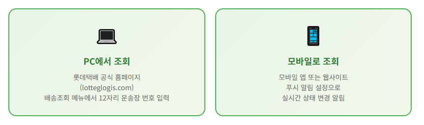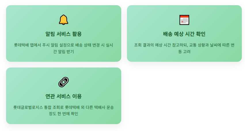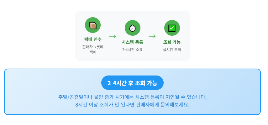⏰ 조회 가능 시점: 일반적으로 상품이 판매자로부터 롯데택배에 인수된 후 2-4시간 정도 지나면 운송장 번호로 조회가 가능해집니다.