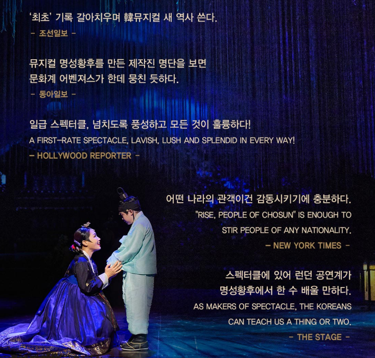 뮤지컬 명성황후는 단순한 공연을 넘어, 역사적 인물을 조명하며 많은 메시지를 전해왔습니다. 특히 젊은 세대에게는 역사를 쉽게 접할 수 있는 기회를 제공했으며, 한국 뮤지컬의 세계화를 이끌어온 작품이기도 합니다.