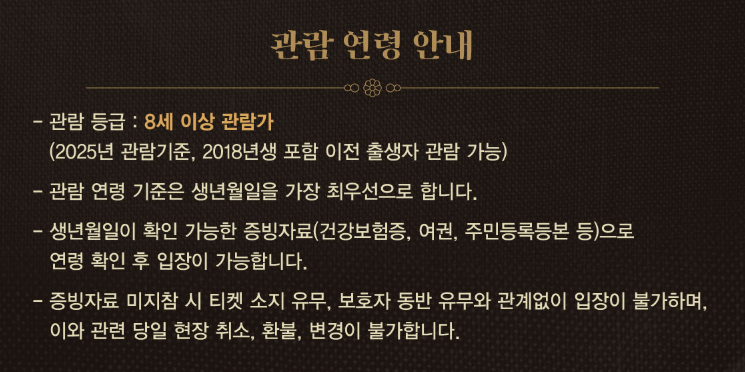 8세 이상 관람가이며, 8세 미만의 어린이는 보호자가 동반하더라도 입장이 제한됩니다.