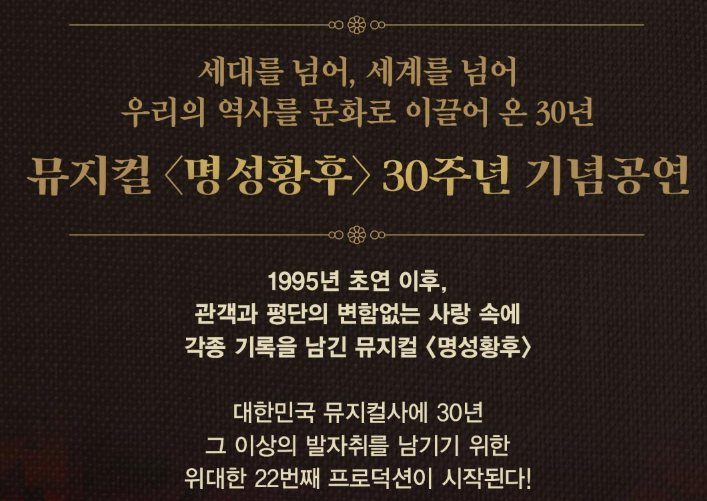 안녕하세요, 공연을 사랑하는 여러분! 오랜 세월 동안 꾸준한 사랑을 받아온 뮤지컬 명성황후가 올해로 30주년을 맞이했습니다. 시간이 흘러도 변함없는 감동과 웅장한 무대, 그리고 배우들의 열연이 다시 한번 관객들을 사로잡을 예정인데요. 이번 기념 공연은 더욱 특별한 연출과 무대 기술을 통해 새롭게 재탄생한다고 합니다. 이 역사적인 순간을 놓치지 마세요!