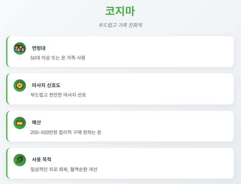 부드럽고 편안한 마사지를 선호하시는 분들께 권하며, 200~500만원 선에서 합리적인 구매를 원하시는 분들에게 좋은 선택입니다. 일상적인 피로 회복이나 혈액순환 개선을 목적으로 하시는 분들이 만족할 수 있는 제품입니다.