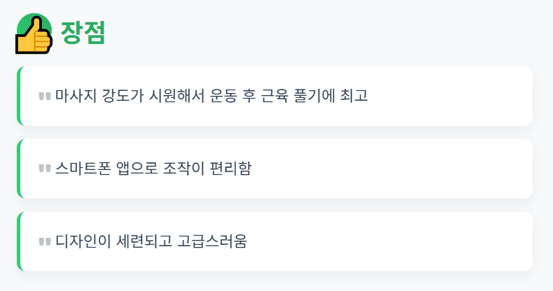- "마사지 강도가 시원해서 운동 후 근육 풀기에 최고"