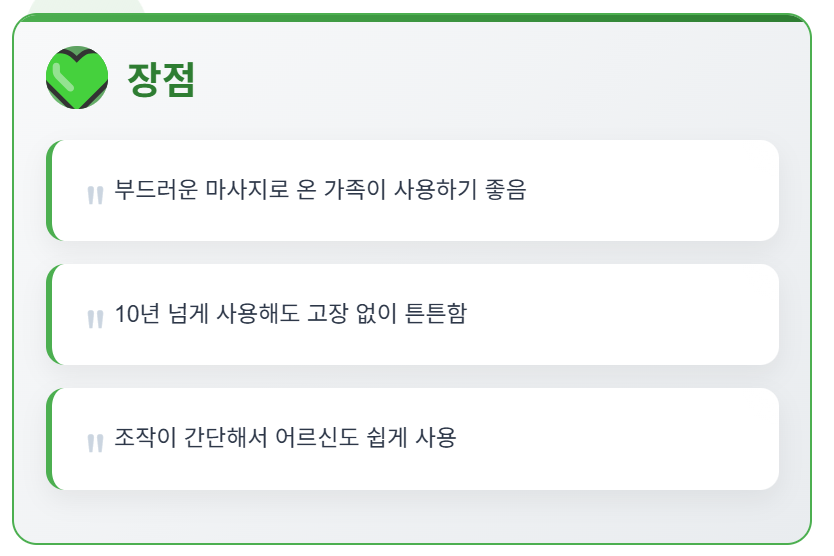 - "부드러운 마사지로 온 가족이 사용하기 좋음"