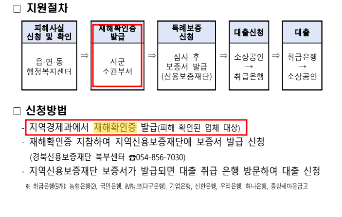 소상공인의 경우 ‘재해확인증’을 통해 중소기업진흥공단, 신용보증재단을 통한 긴급경영안정자금 융자 신청이 가능하며,