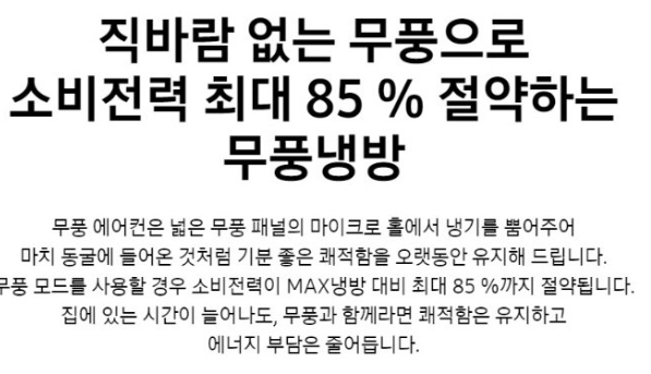 - 최대 85% 소비전력 절감: 무풍 냉방 모드를 사용하면 전력 소모가 크게 줄어듭니다.