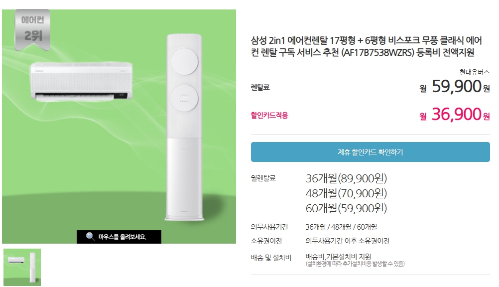 | 무풍 벽걸이형 | 36,900원 | 48개월 |