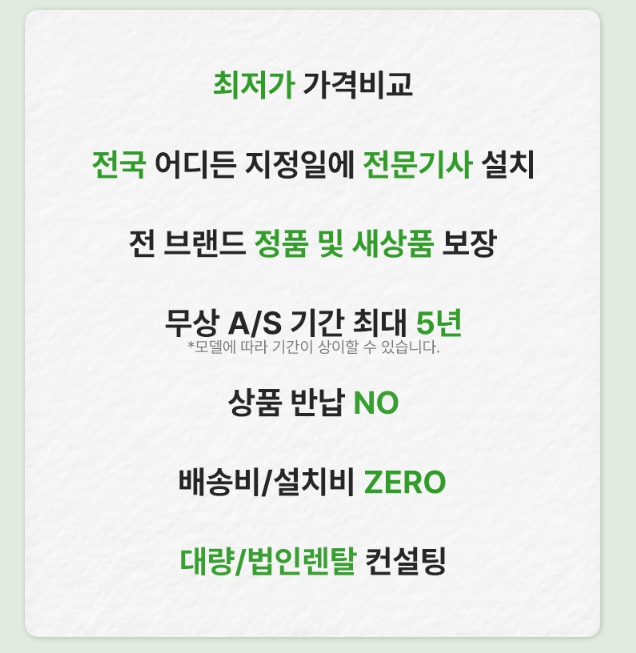 | 유지보수 서비스 포함 | 설치, 필터 교체, 수리 등의 비용이 포함되어 경제적. |
