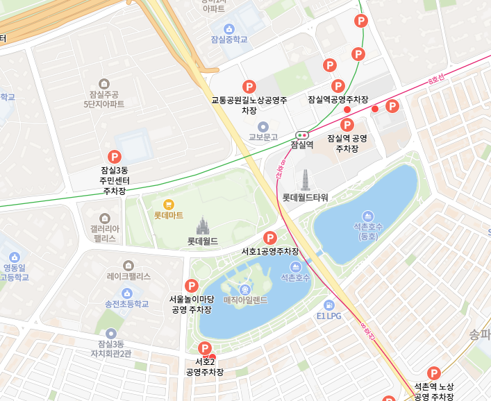 가장 대표적인 공영주차장은 석촌호수 북측 공영주차장입니다. 호수 북쪽에 위치해 있어 롯데월드타워와 가깝고, 160대 정도 주차할 수 있는 규모예요.