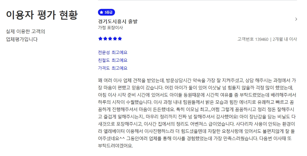 실제 이용자들의 후기를 보면 알 수 있듯이, 만족도 높은 서비스와 합리적인 가격, 추가비용 없는 투명한 견적까지 모두 갖추고 있답니다.