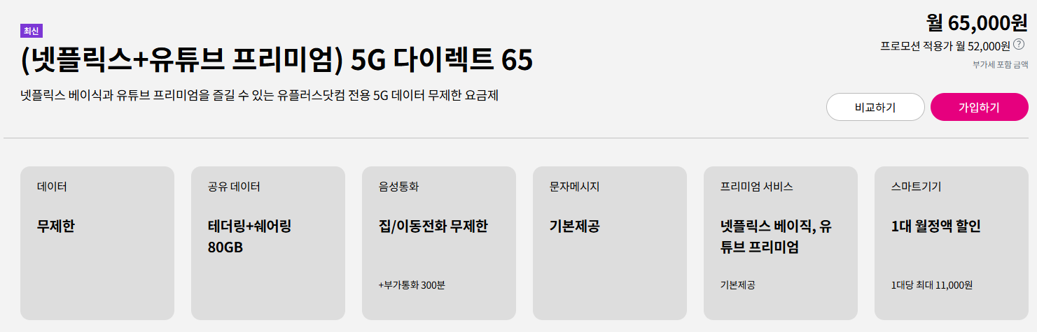 유플러스 5G 다이렉트 65 요금제, 넷플릭스 유튜브 ott 혜택 총정리