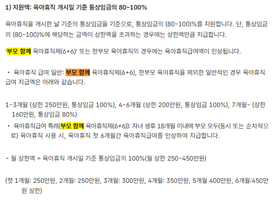 • 부모함께 휴직시: 6개월간 월 최대 450만원까지 가능