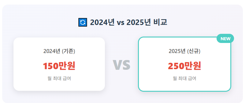 • 2025년 급여 상한액: 월 최대 250만원 (기존 150만원에서 대폭 인상)