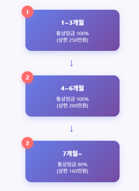 - 1~3개월: 통상임금의 100% (상한 250만원)