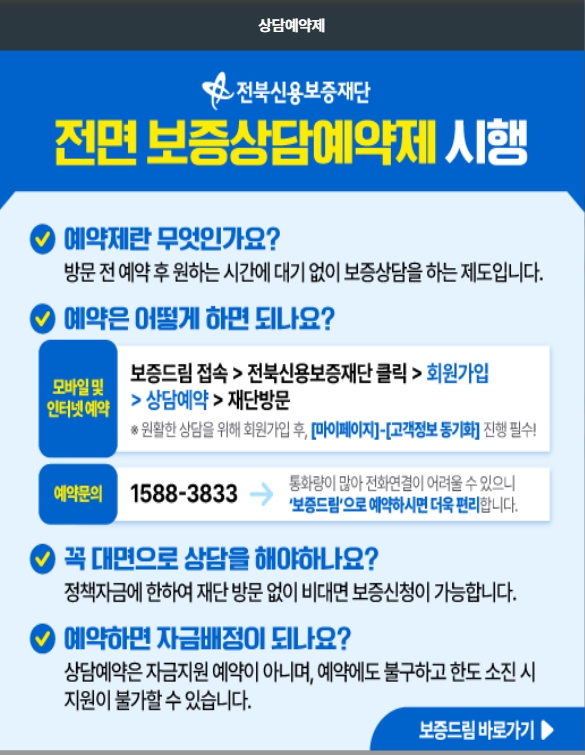 ‘희망더드림 특례보증’은 전북신용보증재단 전면 예약제를 통해 사전 예약 후 상담받는 방식이에요.