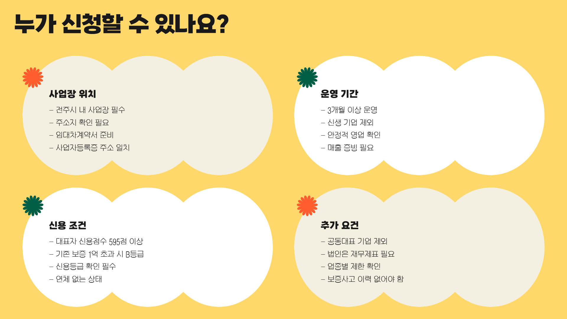 다음 조건을 모두 만족하면 신청 가능해요. 특히 사업장 위치와 신용평가 등급이 핵심이에요!