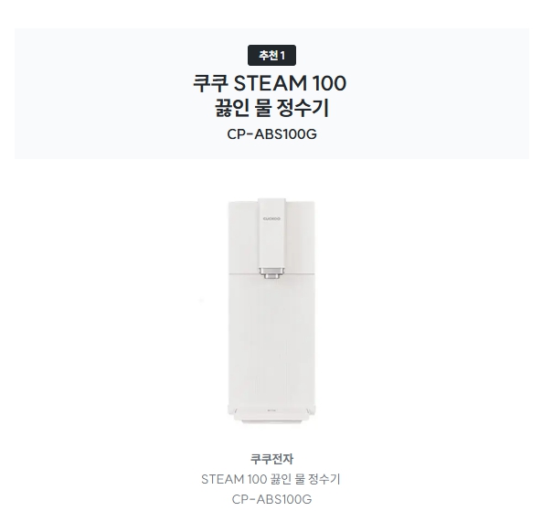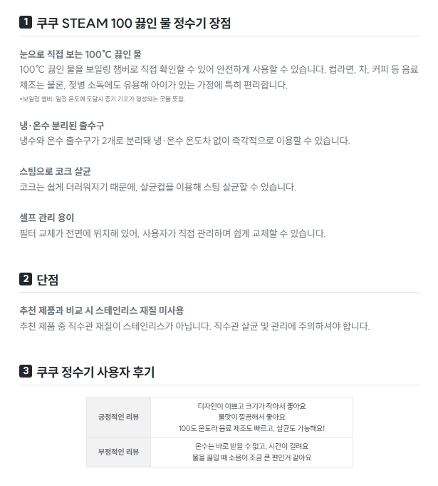 | 쿠쿠 STEAM 100 | 디자인이 예쁘고 끓는 물 바로 나와서 편해요 | 온수 출수 시간 걸림, 스테인리스 아님 |