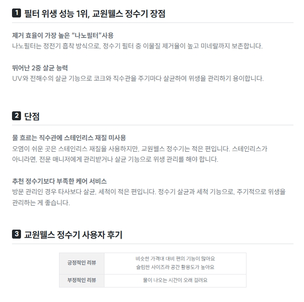 | 교원웰스 더뉴 | 가격 대비 성능 만족, 위생 기능 좋음 | 살균 유지관리 직접 해야 해서 귀찮음 |