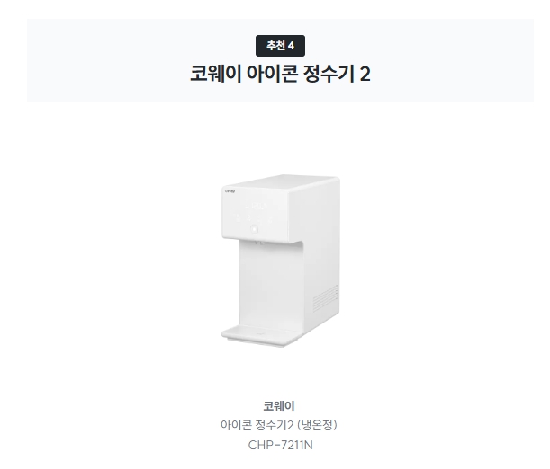 | 코웨이 아이콘2 | 슬림해서 주방에 잘 어울림, IoT 진단 편리 | 온수 기다림 시간 있고, 잔수 배출 번거로움 |