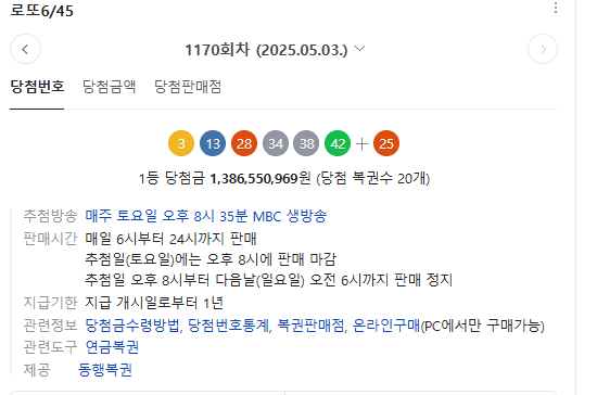 2025년 5월 4일 기준, 제1170회 로또 추첨 결과가 발표되었습니다.
