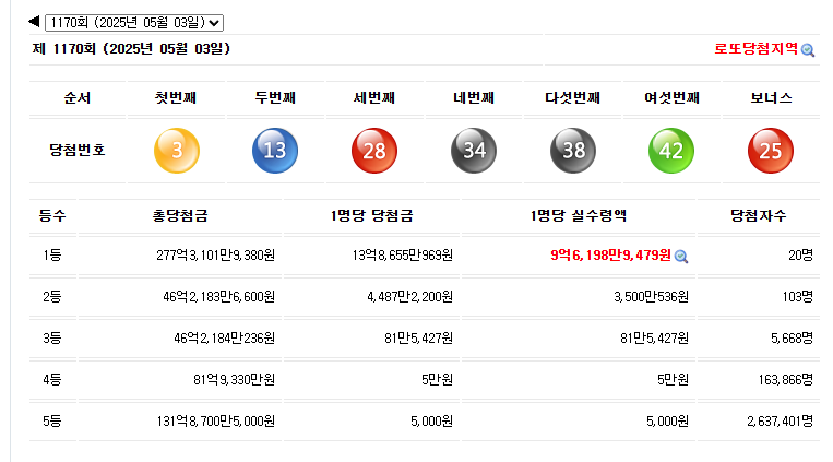 - 당첨번호: 3, 13, 28, 34, 38, 42