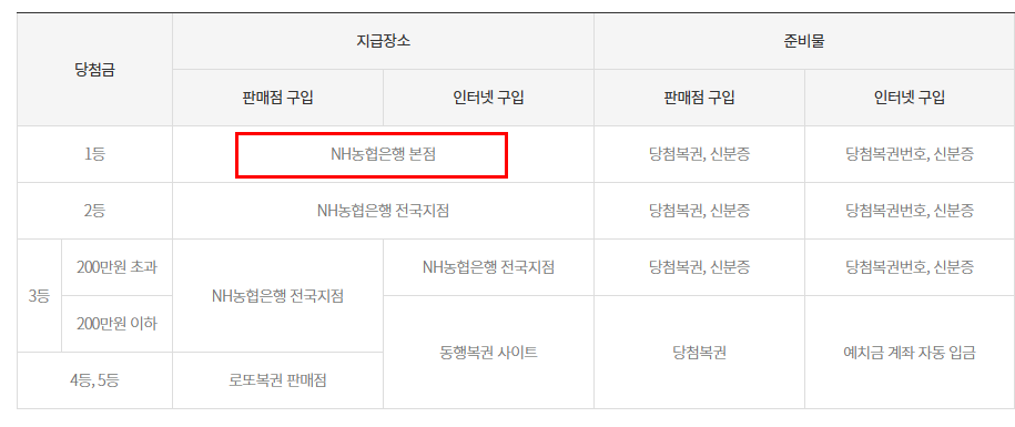고액 당첨은 농협 본점에서 신분증과 복권 실물을 지참해야 하며, 일반 당첨은 인근 농협 지점에서도 수령 가능합니다.