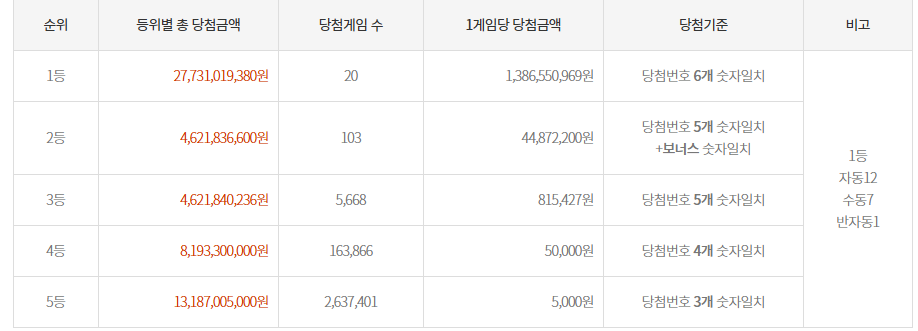 - 1등 1인당 당첨금: 약 13억 8,655만 원