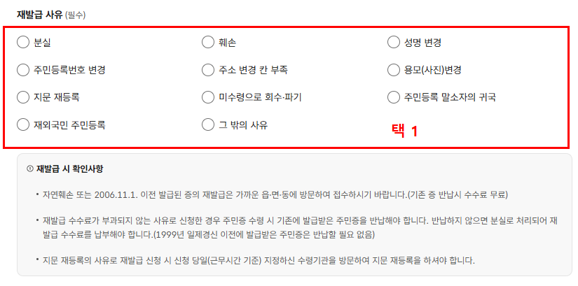 4단계: 재발급 사유 선택 (분실, 훼손, 기타)