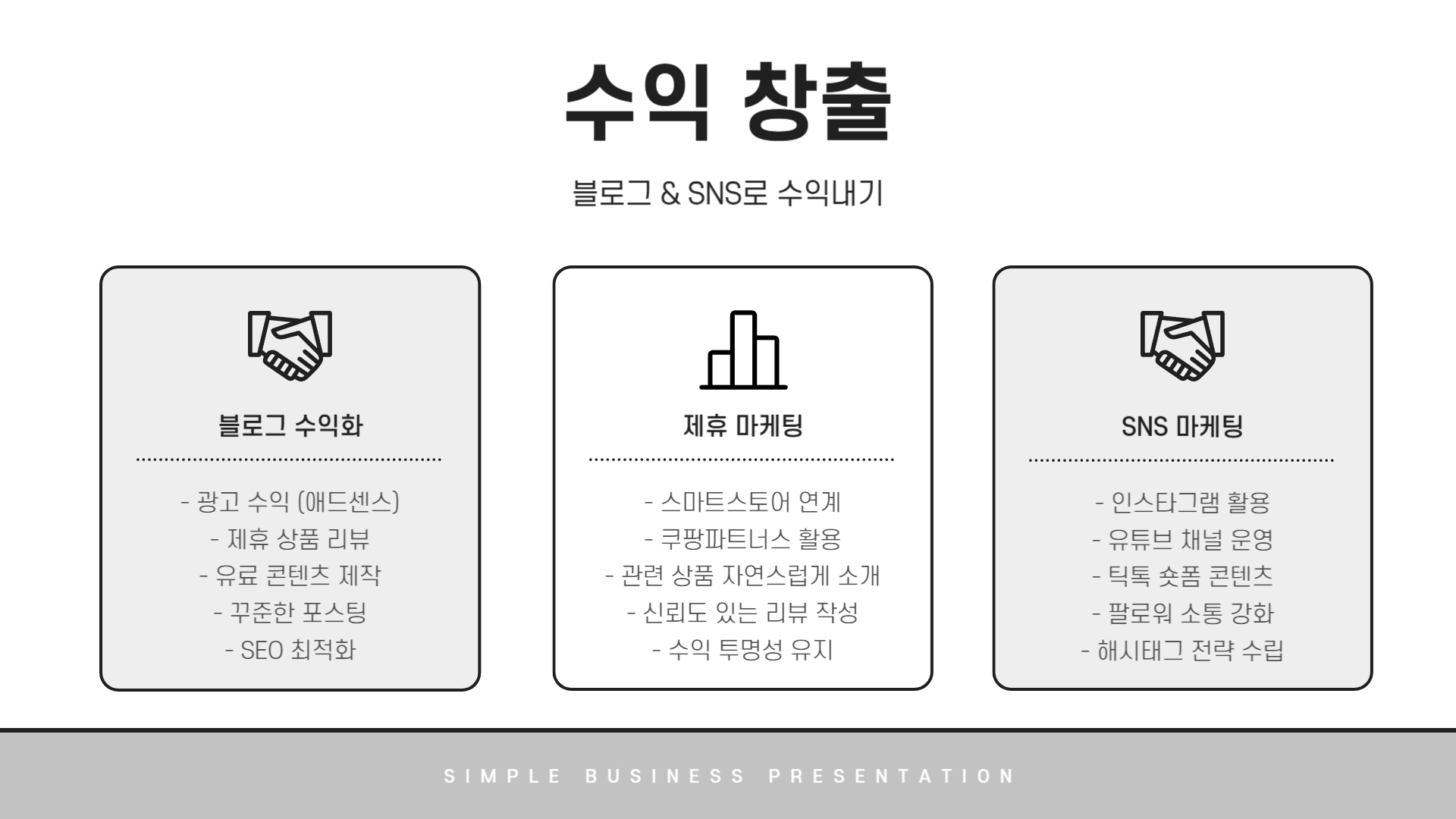 이후 트래픽이 생기면 광고나 제휴 수익으로 연결할 수 있어요.