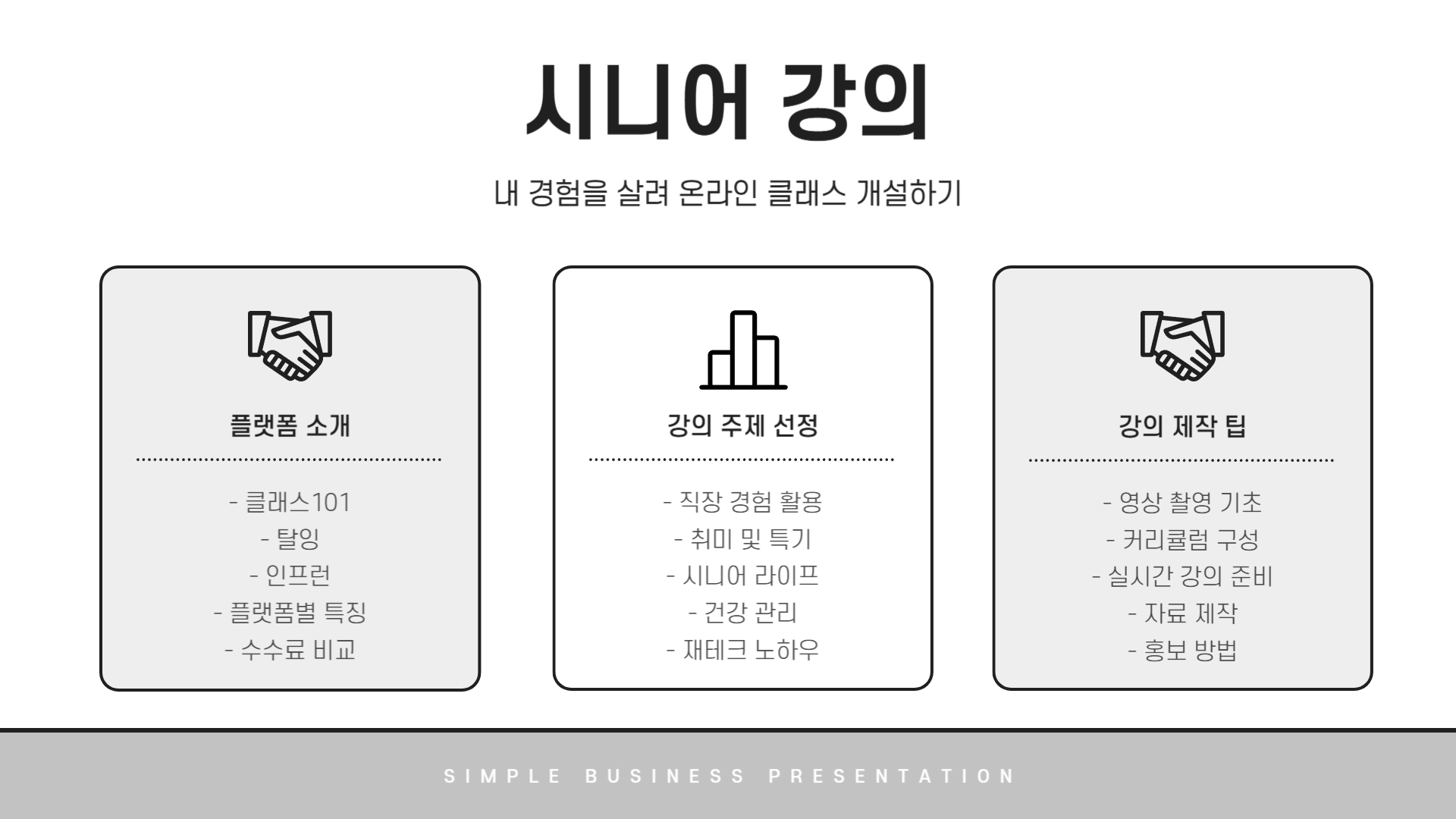 시니어 특화 강의에 대한 수요가 꾸준히 늘고 있습니다. 자신 있는 주제가 있다면 분명한 경쟁력이 있어요.