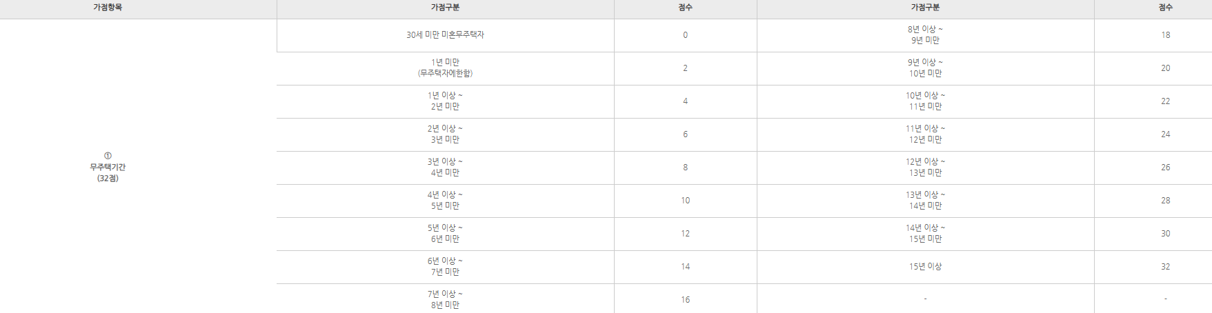 | 무주택 기간 | 8년 (16점) | 15년 (32점) |