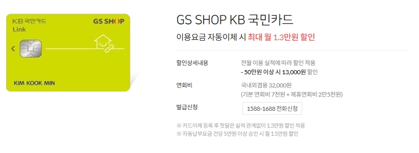 | GS SHOP KB 국민카드 | 월 50만원 이상 사용 | 최대 13,000원 |