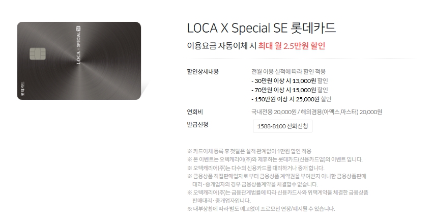 | LOCA X Special SE 롯데카드 | 월 30만원 이상 사용 | 최대 25,000원 |