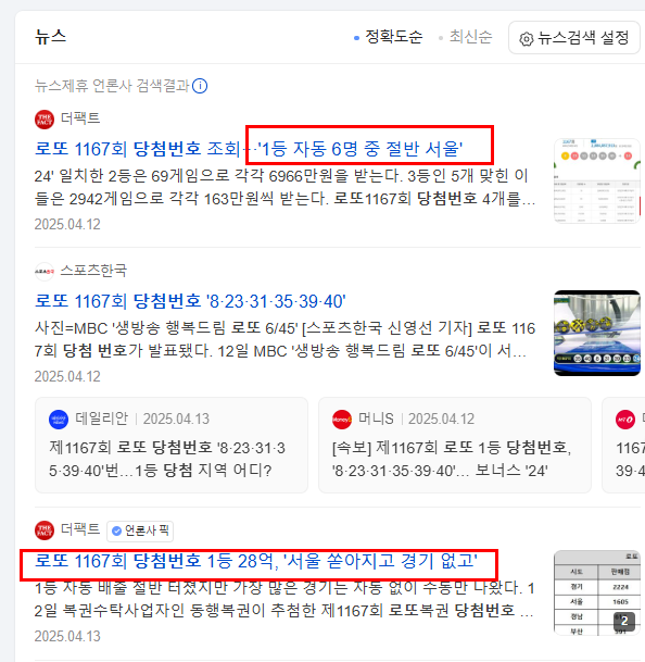 지난주(1167회)에서는 1등 6명 중 절반인 3명이 서울에서 나왔습니다. 이번주는 어떨지 결과가 기대되네요.