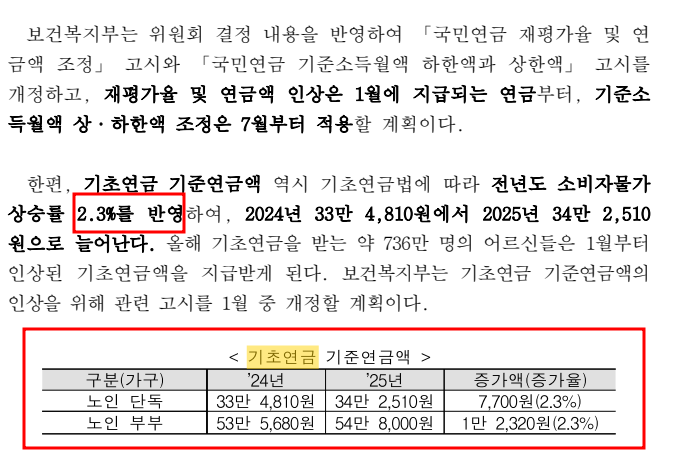 국민연금과 기초연금 인상은 2025년 1월부터 적용되고, 기준소득월액 상·하한 조정은 7월부터 적용됩니다.