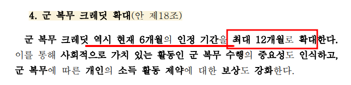 | 군복무 크레딧 | 최대 6개월 | 최대 12개월까지 확대 |