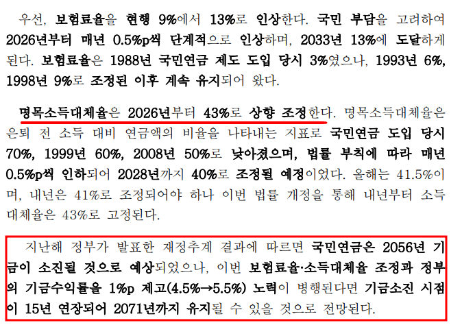 | 2026년 이후 | 43% 고정 | 연금개혁 법안 통과 후 |