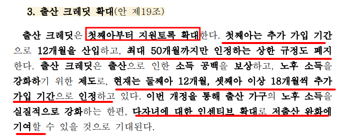 | 출산 크레딧 | 둘째아 이상, 최대 50개월 | 첫째부터 인정, 상한 폐지 |