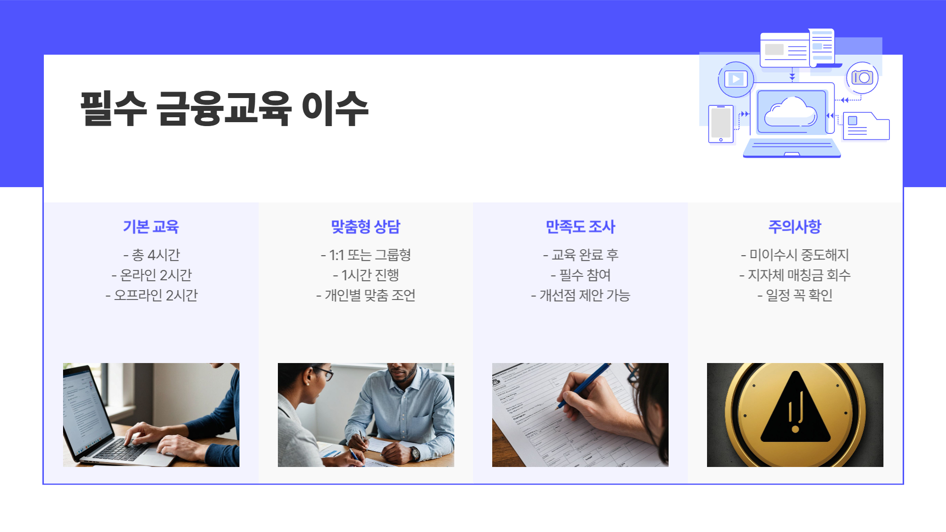 - 기본 금융교육 4시간 (온라인 2시간 + 오프라인 2시간)