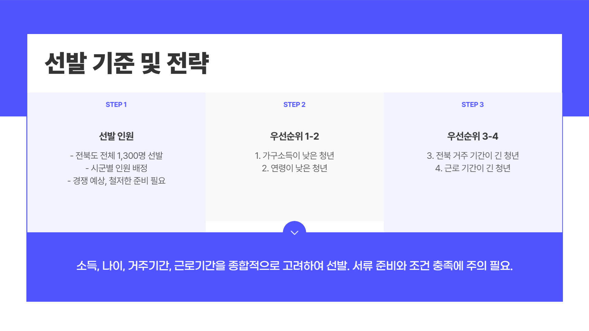 이번 사업은 전북도 전체 1,300명만 선발합니다. 시군별 인원도 정해져 있기 때문에 경쟁은 꽤 치열할 수 있어요. 그렇다면 어떤 기준으로 선발할까요?