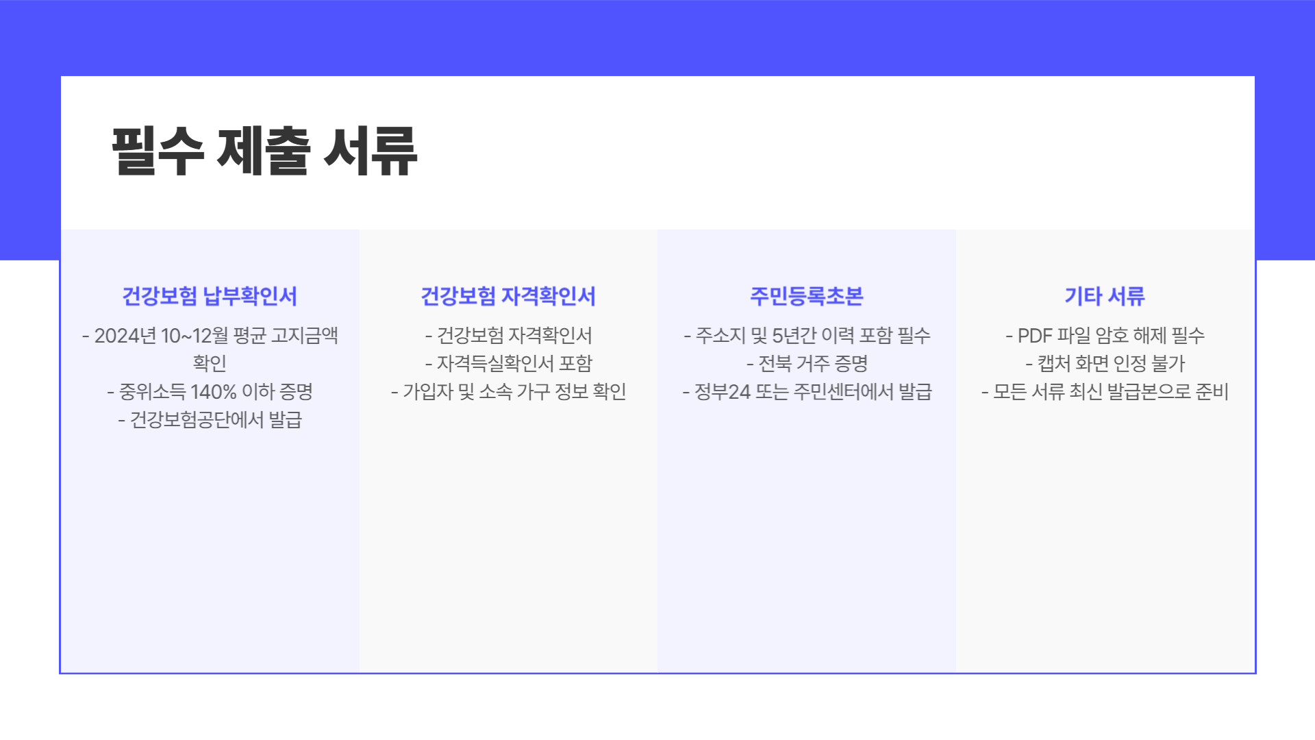 | 주민등록초본 | 주소지 및 5년간 이력 포함 필수 | 정부24 또는 주민센터 |